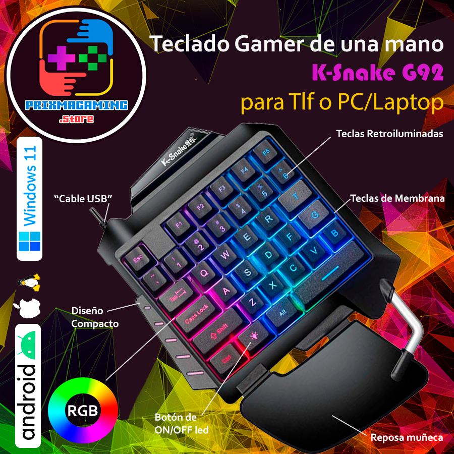 Teclado Gamer RGB de una mano para TLf PC o Laptop, K-Snake G92 Delivery Gratis hasta el Central Madeirense, Prado, Luxor, C.C Guacara Plaza, Pradera, Apartamentos Malave. C.C Piedra Pintada, Hospital de Guacara y otros puntos no mayor a 4km si no son los indicados, de 4km a 8km $2, WhatsApp 0/4/1/2/0/6/0/5/6/8/7, síguenos en Instagram como @prixmagaming.store Somos tienda física.